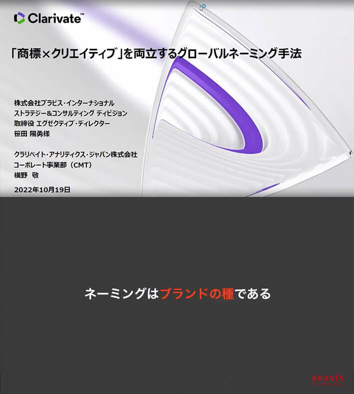 2022年10月19日,由科睿唯安日本有限公司主办的题为“‘商标×创意’并存的全球命名方法”网络研讨会顺利举行。我司战略与咨询部门总监笹田阳勇先生应邀登台演讲。