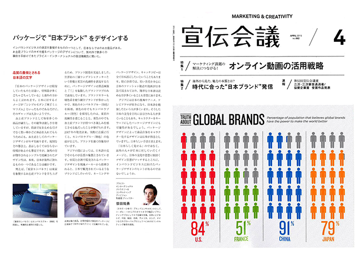 在《宣伝会議》4月号中,采访了我司战略与咨询团队的总监笹田阳勇,刊登了题为《通过包装设计看日本品牌变迁》的文章。 采访中,笹田先生聚焦于“伴手礼品牌”,讨论了海外游客对日本包装设计的印象差异,以及对于包装中使用日语会带来的高品质印象等购买心理等话题。
